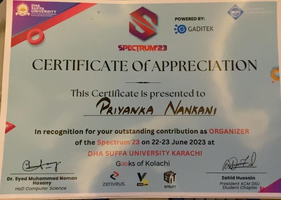 Participated in the Web Development Competition organized by Spectrum and also volunteered in its organization, contributing to event coordination and participant support.
