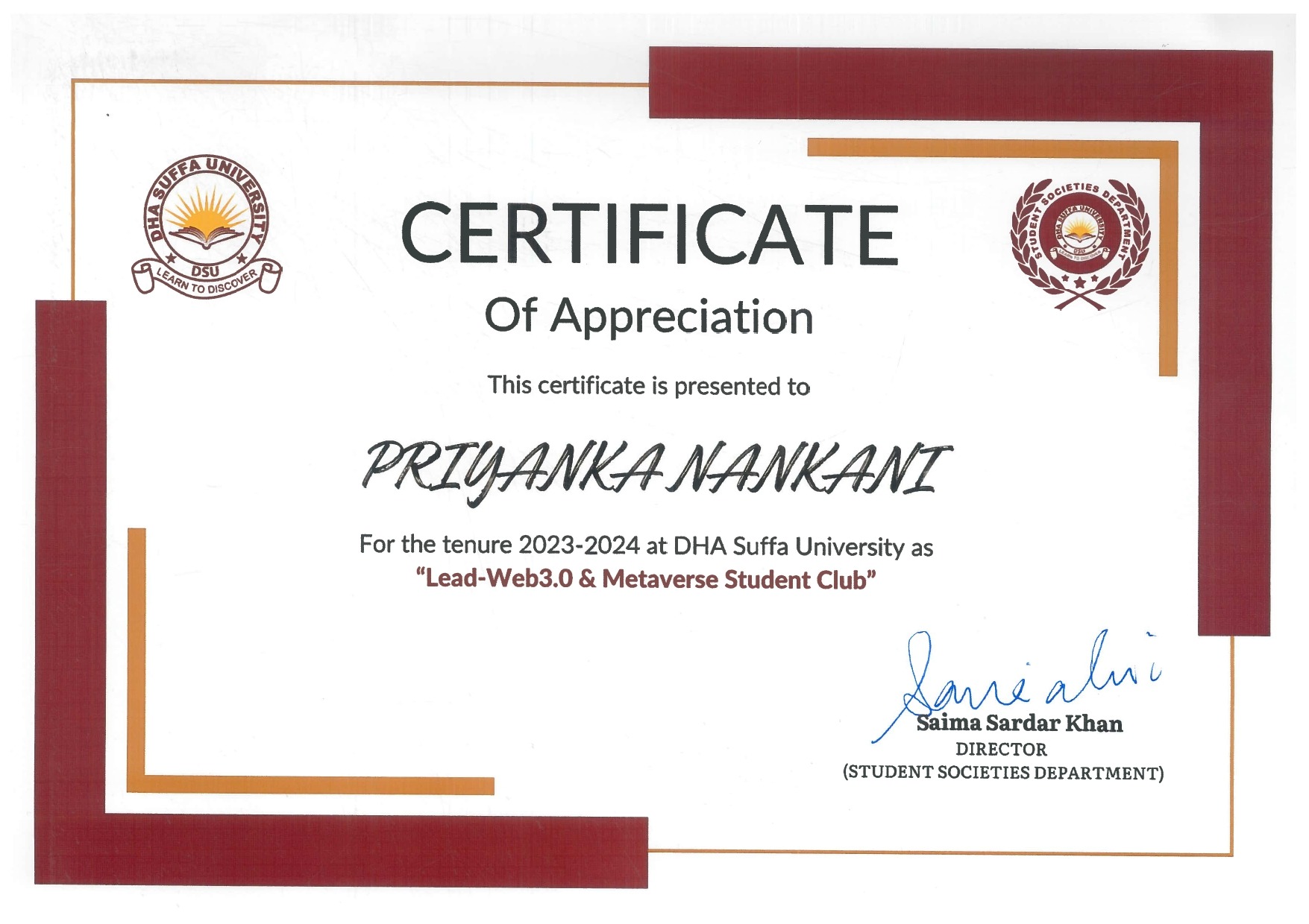 I co-founded and led the Web 3.0 and Metaverse club at my university, where I took the initiative to organize workshops, seminars, and hands-on sessions for students. Through this role, I created opportunities for peers to learn about emerging technologies, encouraged collaboration, and built a network that connected students with industry trends and innovation.
