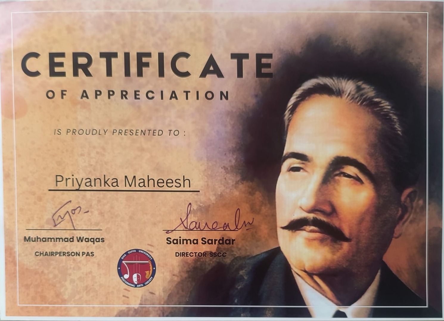 Apart from academics, I actively participated in cultural activities, earning a certificate for my singing performance as a member of the university’s music society