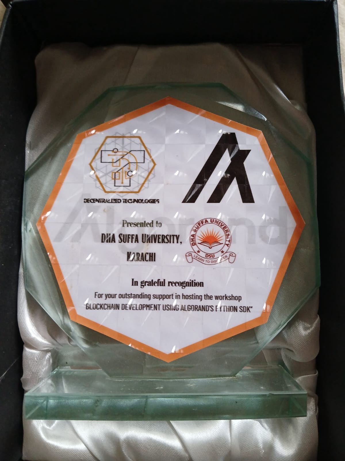 Received a shield from Algorand for successfully conducting a workshop on blockchain development using the Python SDK. The session introduced students to Algorand’s architecture, smart contracts, and hands-on development with the Py-Algorand-SDK, while also giving them an opportunity to connect and network with the Algorand team