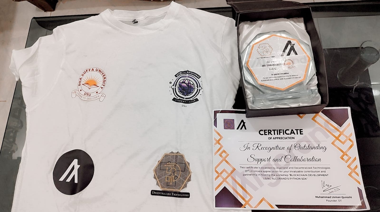 Received a shield from Algorand for successfully conducting a workshop on blockchain development using the Python SDK. The session introduced students to Algorand’s architecture, smart contracts, and hands-on development with the Py-Algorand-SDK, while also giving them an opportunity to connect and network with the Algorand team